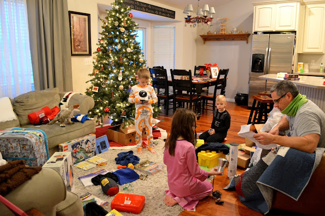 Emil wasn't as cooperative for a present photo. He got a wagon and a bucket of Legos from Santa, ski lessons and a balaclava from Dad, the illustrated Harry Potter book and piano books (with lessons) from me (there was a little drama when he saw the piano books and loudly said he didn't want them), a truck with a trailer and side-by-side from Bridget, a scratch art dinosaur book from Colin, hoodie and book from Grandma and Grandpa Lee (and the neck cozy), markers and case from Mom and Dad, and a hammock from the Boney family. (I'm writing all of this down because we are getting the Thank You cards out this year if it KILLS me.)